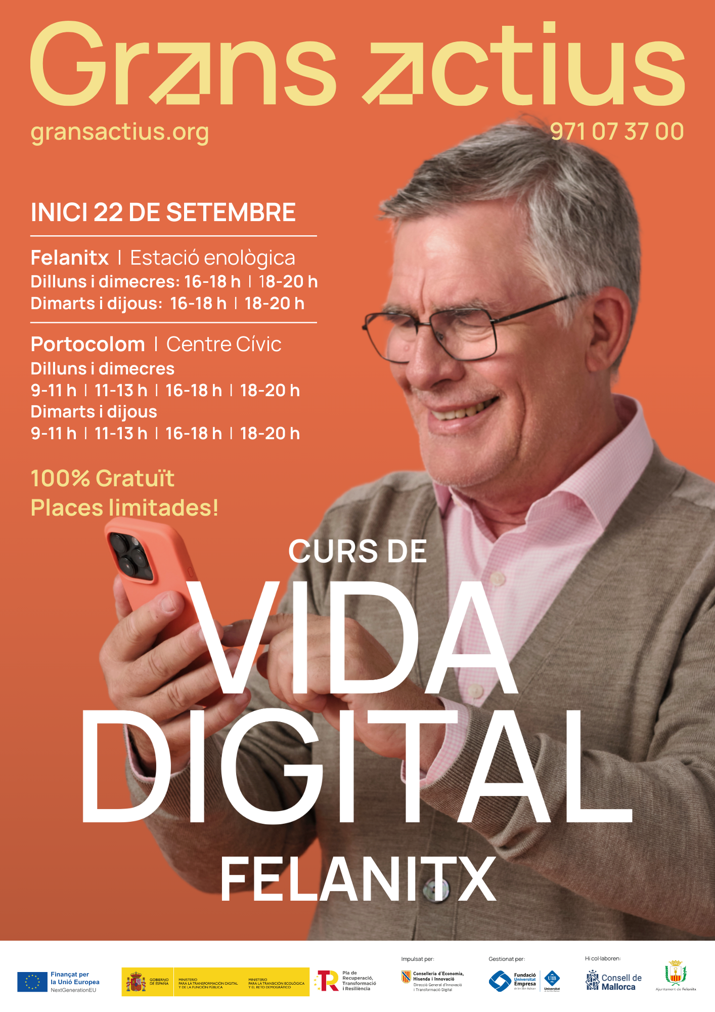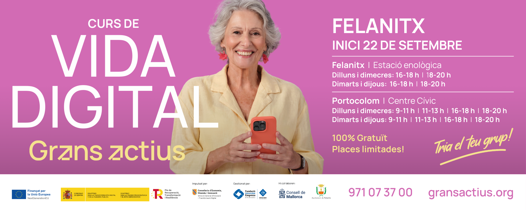 A partir del 22 de setembre, Felanitx serà un dels municipis que acollirà el programa Grans Actius amb el Curs de Vida Digital, una iniciativa formativa totalment gratuïta adreçada a persones majors de 55 anys per a reduir la bretxa digital i fomentar la seva participació en el món digital.