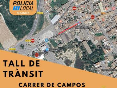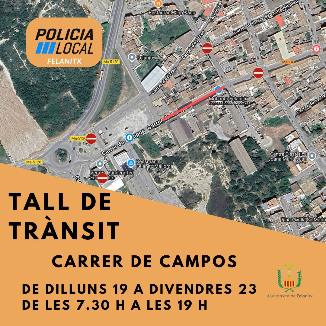 De dilluns dia 19 a divendres dia 23 de maig el CARRER DE CAMPOS estarà TANCAT al trànsit de les 7.30 H del matí a les 19 H de l'horabaixa.