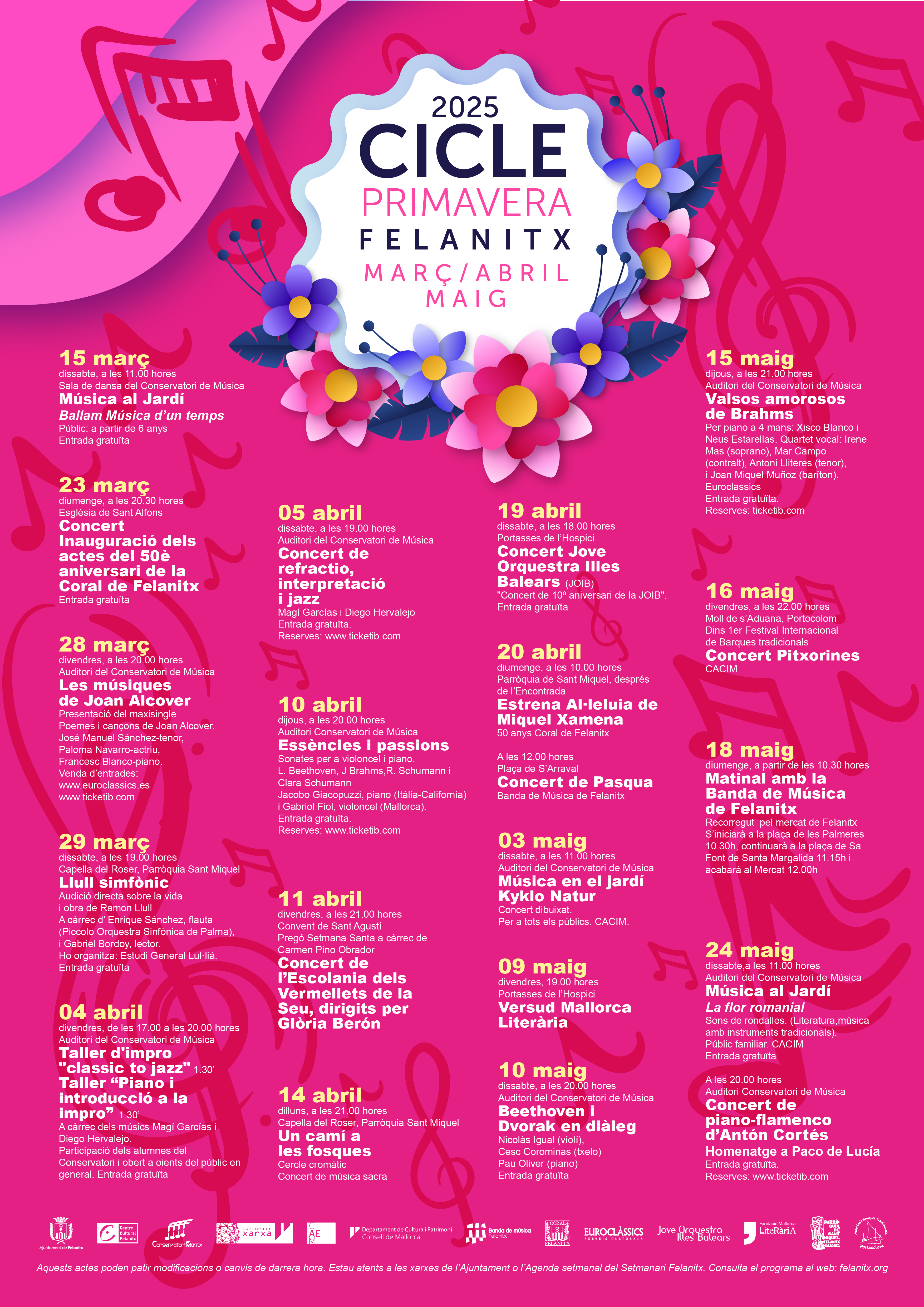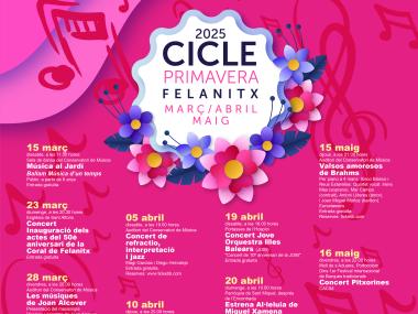 El departament de Cultura de l'Ajuntament de Felanitx ha preparat un ampli programa cultural i musical per aquesta primavera. La nova edició del Cicle de Primavera 2025 començarà aquest dissabte dia 15 de març i s’allargarà fins al vinent 24 de maig. Seran dos mesos i mig amb actes musicals arreu del municipi.