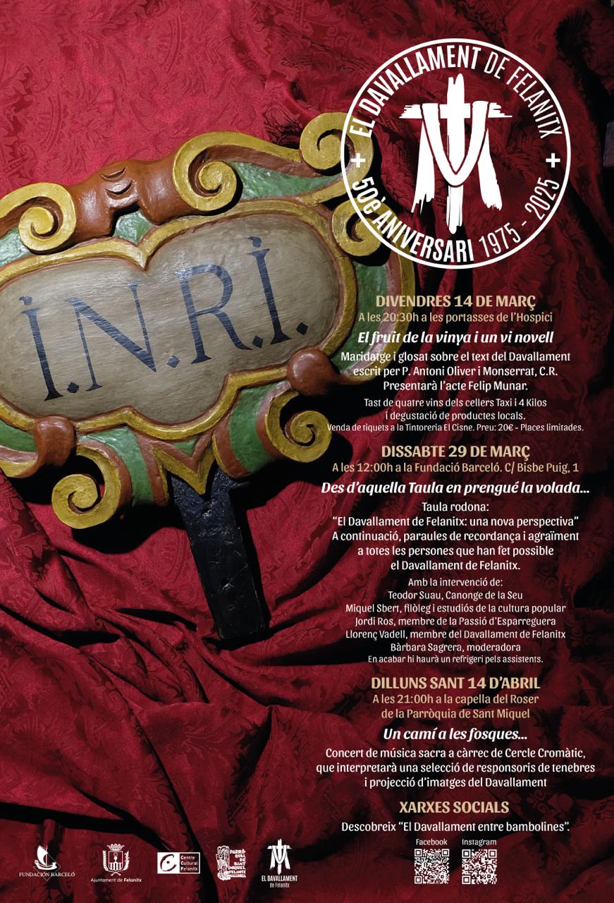 El Davallament de Felanitx complirà aquest any 50 anys d’ençà de la seva primera representació teatral fora de l’església de Sant Miquel de Felanitx, això fou el 1975. D’aquells inicis a avui aquesta representació religiosa ja s’ha fet un espai dins la societat felanitxera i ja són més de 200 les persones que en formen part.