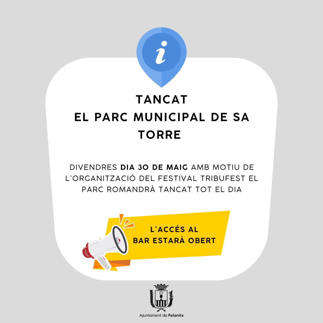 3. el proxim divendres dia 30 de maig el parc municipal de sa torre romandra tancat