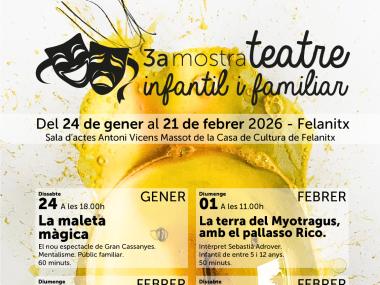 La Casa de Cultura de Felanitx acollirà, del 24 de gener al 21 de febrer de 2026, la 3a Mostra de Teatre Infantil i Familiar, una proposta cultural adreçada als infants i a les famílies que oferirà quatre espectacles de qualitat a la Sala dActes Antoni Vicens Massot.
