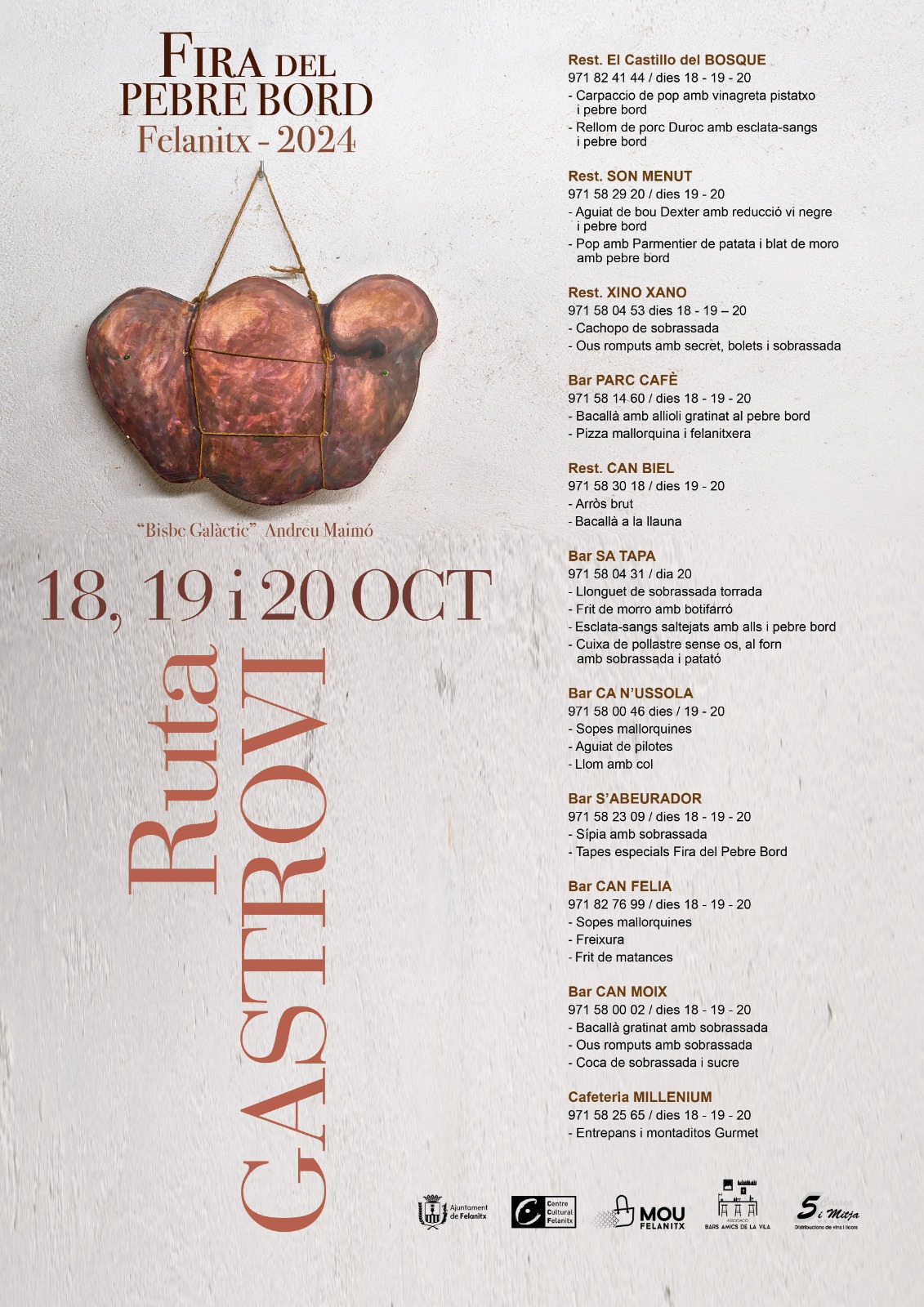 Aquest any la imatge de la fira és obra de l’artista felanitxer, Andreu Maimó qui ha recuperat per a l’ocasió l’obra Bisbe Galàctic. Una de les peces més emblemàtiques de les matances, el bisbe, i que Maimó elaborà per un antic espectacle de la Televisió Felanitxera i que ara, anys després, servirà per a il·lustrar l’edició de la Fira del Pebre Bord 2024.