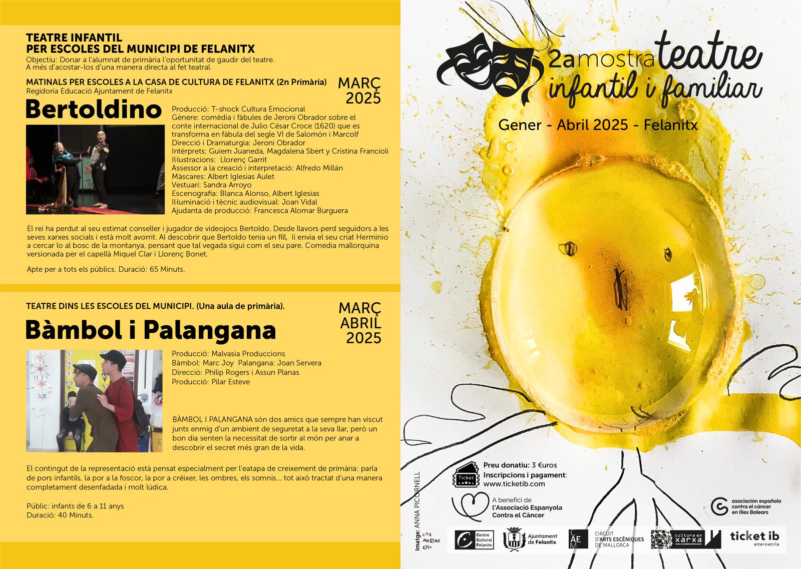 La II Mostra de Teatre Infantil i Familiar compte amb el suport del Circuit d'Arts Escèniques de Mallorca del Consell de Mallorca i les entrades solidàries de tres euros ja es poden aconseguir al lloc web de ticketib.com.