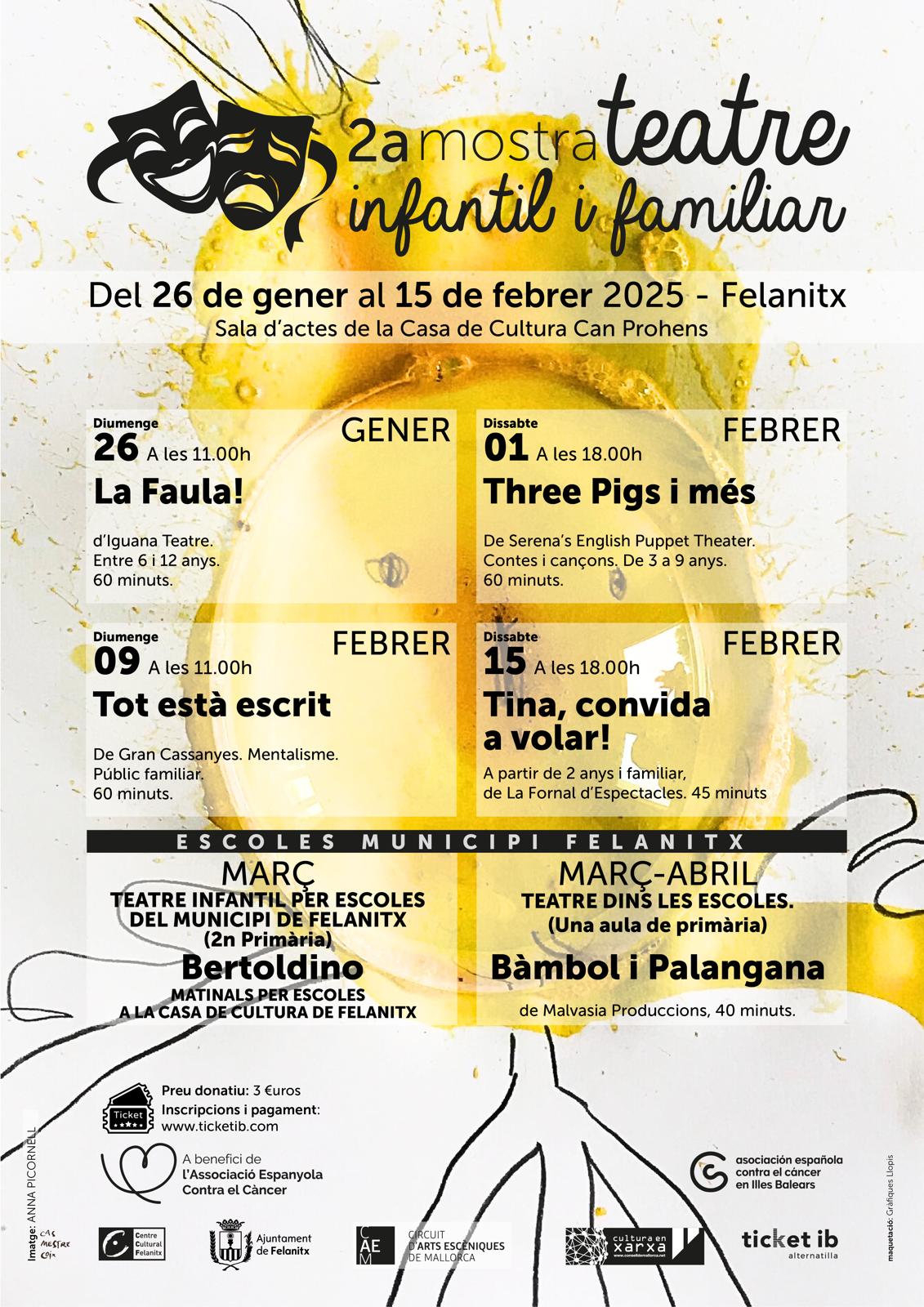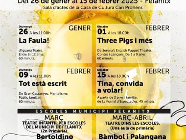 L'Ajuntament de Felanitx ha programat una segona edició de la Mostra de Teatre Infantil i Familiar. Serà amb el mateix format que en la primera edició i hi haurà quatre representacions entre el 26 de gener i el 15 de febrer. A més, a aquestes propostes s’hi sumen les representacions teatrals a les escoles de tot el municipi els mesos de febrer, març i abril.