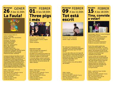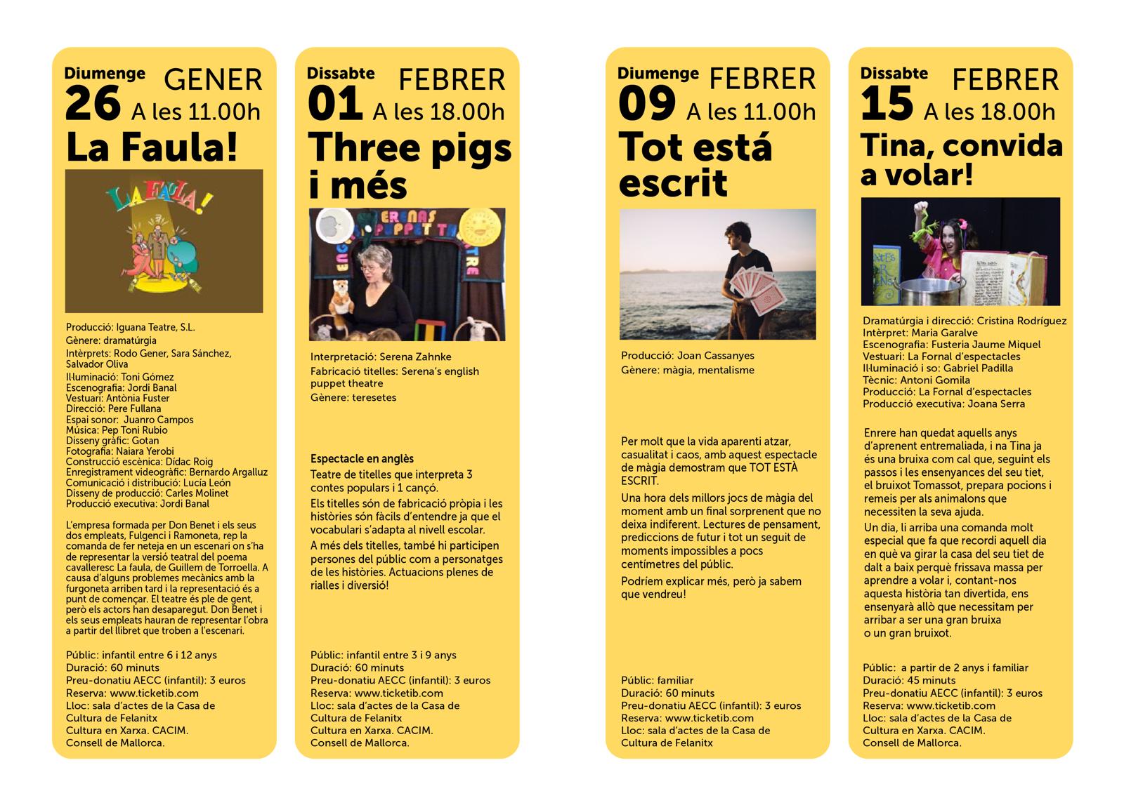 A més d'això la tècnica de Cultura de l'Ajuntament de Felanitx, Anna Rovira ha explicat que “prioritzam les companyies de teatre infantil i familiar de Mallorca. I el que feim és intentar donar una àmplia mostra dels diferents tipus de teatre que els infants puguin veure que s’ho poden passar bé amb diferents obres de teatre i gèneres teatrals”.
