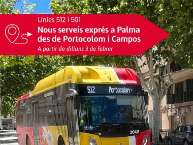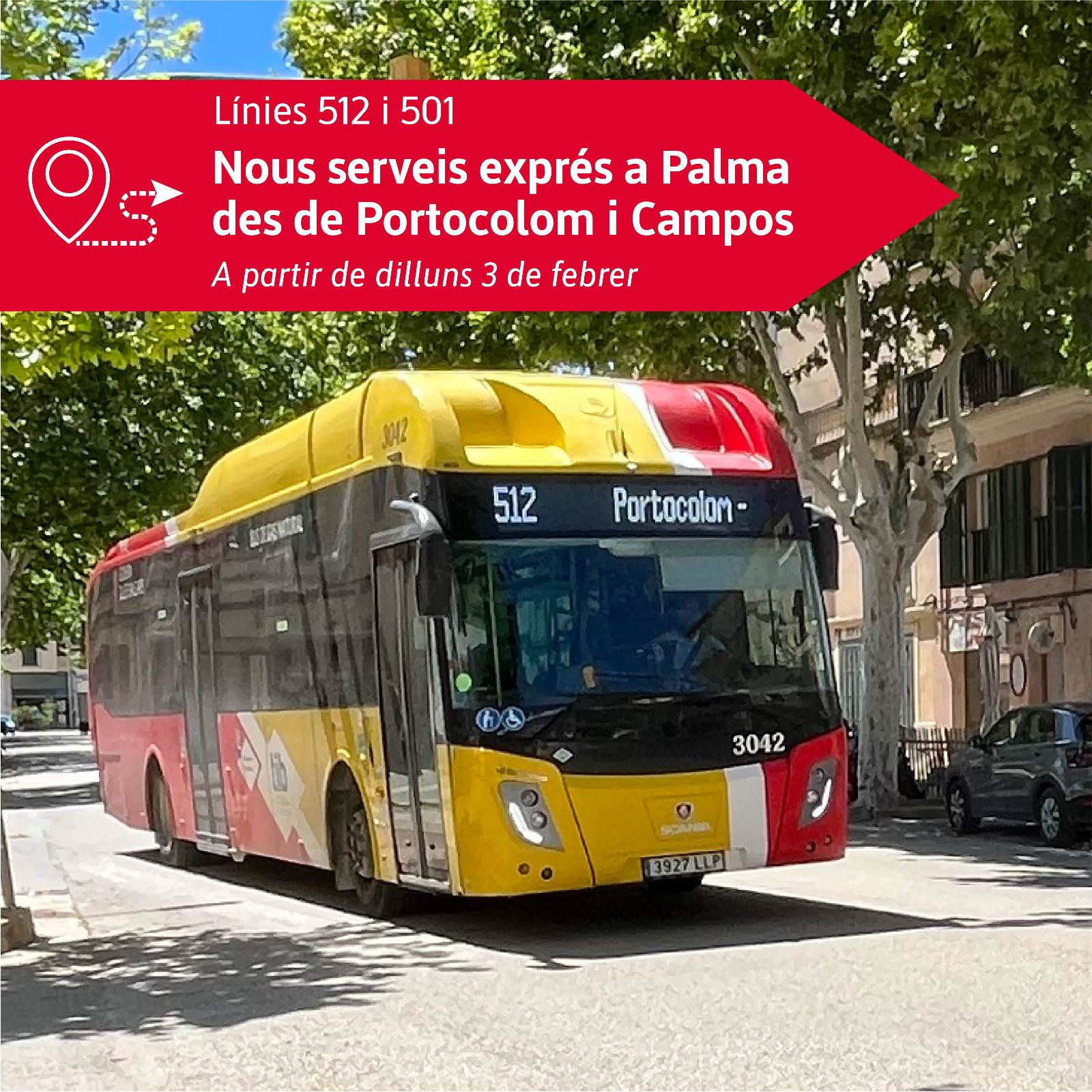 A partir del dia 3 de febrer, els usuaris de Portocolom disposaran d’un servei directe fins a Palma a primera hora del matí de dilluns a divendres amb la línia 512 Portocolom – Felanitx. També la línia 501 Manacor – Campos – Palma incorpora un nou servei exprés a Palma des de Campos a les 14.25 h.