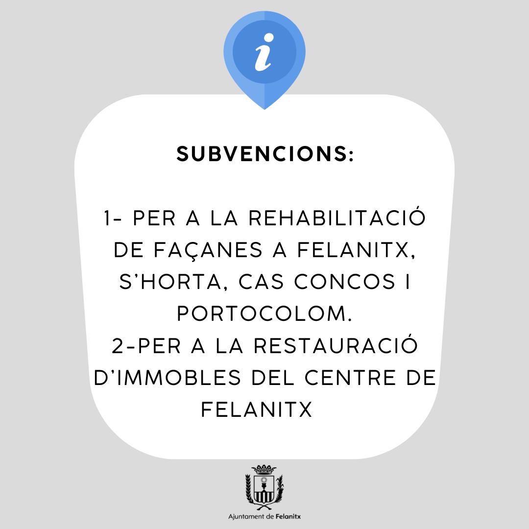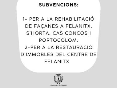 Aquesta setmana la Junta de Govern local ha aprovat les subvencions per a la Rehabilitació de Façanes a Felanitx, s’Horta, Cas Concos i Portocolom. A aquesta subvenció s’hi destina la quantitat de 30.000 euros.